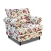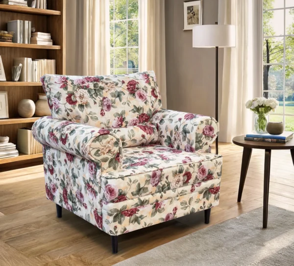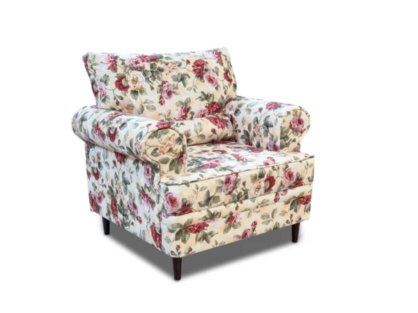 Ruchome poduszki pozwalają na idealne dopasowanie do osoby siedzącej, a szerokie, miękko wyprofilowane podłokietniki zapewniają wygodne oparcie dla przedramion. Obicie z tkaniny o subtelnym, kwiatowym wzorze w połączeniu ze starannym wykończeniem lamówkami nadaje fotelowi wyjątkowego uroku i ponadczasowego charakteru.