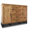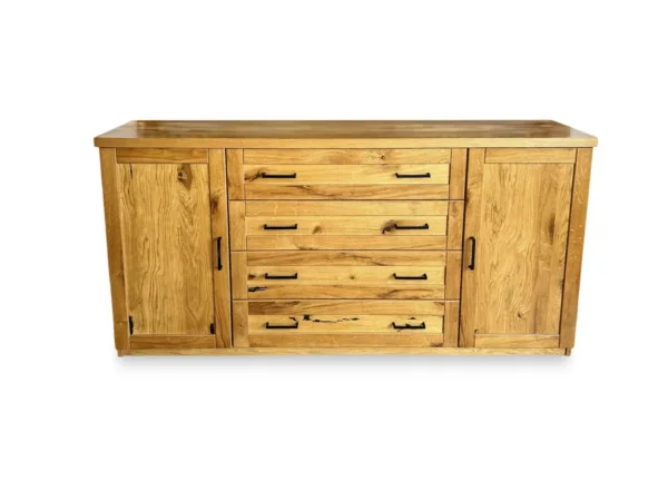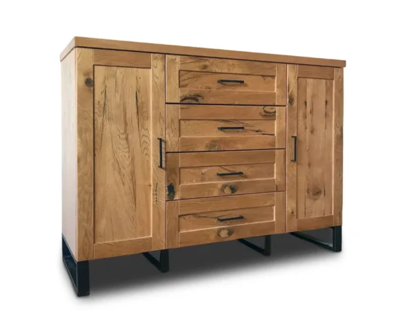 Model 4S4D został zaprojektowany z myślą o wygodnej organizacji przestrzeni. Cztery pojemne szuflady oraz dwie zamykane szafki zapewniają dużo miejsca na ubrania, dokumenty, tekstylia lub akcesoria domowe, pomagając utrzymać porządek w każdym wnętrzu. Stabilny blat idealnie sprawdzi się do ekspozycji dekoracji, roślin lub rodzinnych pamiątek, a podwyższone nóżki ułatwiają utrzymanie czystości pod meblem. Naturalne drewno gwarantuje trwałość oraz odporność na codzienne użytkowanie, a każdy egzemplarz wyróżnia się unikalnym rysunkiem słojów charakterystycznym dla mebli wykonanych z litego drewna.