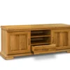 Środkowa część posiada wnękę podzieloną półką, dzięki czemu zyskała dwie wolne przestrzenie na sprzęt RTV. Pod wnęką została zamontowana funkcjonalna szuflada na drobiazgi. Boczne komory zamykane są pełnymi drzwiczkami, a w środku znajduje się jedna półka.