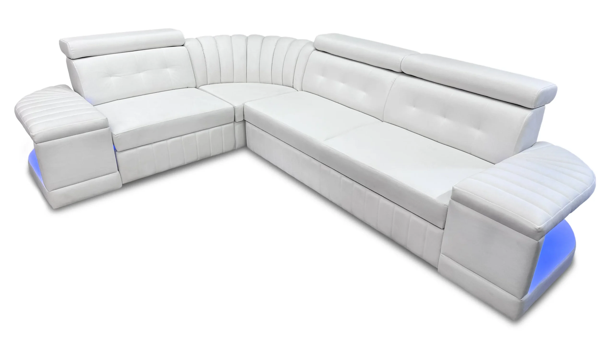 Ten elegancki narożnik to idealne połączenie nowoczesnego wzornictwa i maksymalnej wygody. Jego zaokrąglona linia i starannie wykonane przeszycia nadają mu wyjątkowy, designerski charakter, który przyciąga wzrok i podkreśla styl pomieszczenia. Wbudowana funkcja RELAX pozwala na wysunięcie siedziska, co zapewnia dodatkowy komfort podczas odpoczynku. Dodatkowo, delikatne niebieskie podświetlenie LED tworzy przyjemną atmosferę – idealną do wieczornego relaksu z książką, filmem lub w gronie bliskich. To nie tylko mebel, ale prawdziwa strefa relaksu w Twoim domu.