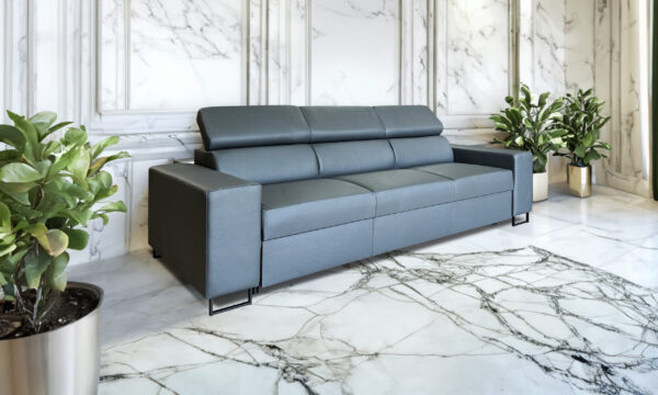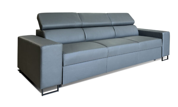 Ponadto kanapa jest rozkładana, dzięki czemu w razie potrzeby zmienia się w wygodne miejsce do spania o wymiarach 130×190 cm. Ciekawym elementem designu są wysokie metalowe nóżki, które w połączeniu z naturalną skórą nadają sofie wyjątkowo eleganckiego wyglądu.