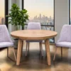 Stół P3 to połączenie wyjątkowego designu i trwałości. Blat o średnicy 120 cm wykończony naturalnym fornirem dębowym prezentuje się elegancko i ponadczasowo. Po rozsunięciu dwóch wkładek po 50 cm stół osiąga długość aż 220 cm, co pozwala wygodnie pomieścić większe grono gości.