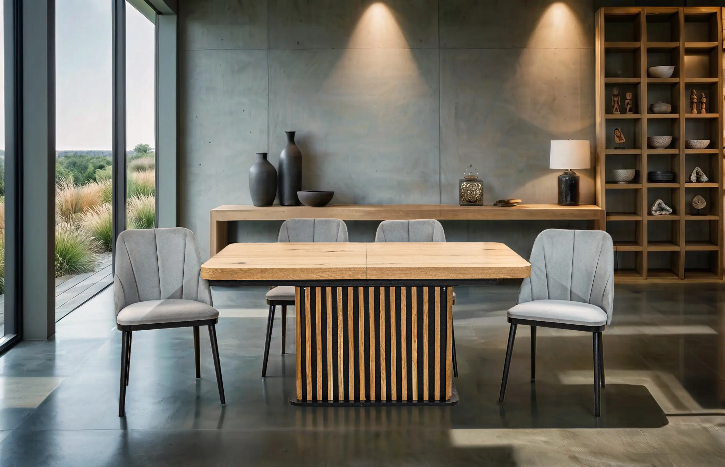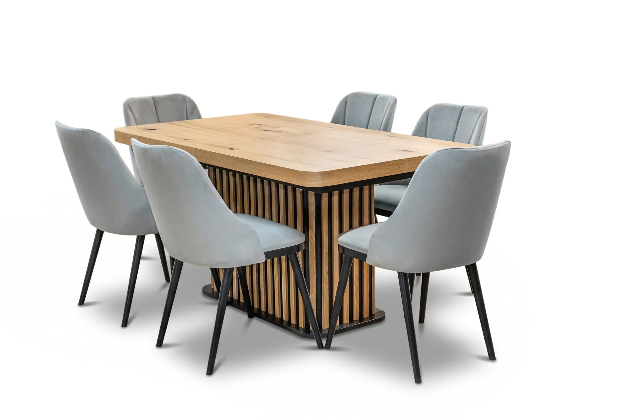 Mebel wyróżnia się charakterystyczną, lamelowaną podstawą wykonaną z pionowych drewnianych listew. Blat o ciepłym, miodowym wykończeniu, z widocznymi naturalnymi sękami dodającymi charakteru. Czarna rama podstawy tworzy elegancki kontrast z drewnianymi elementami. Stół reprezentuje nowoczesne podejście do designu, łącząc funkcjonalność z estetyką. Doskonale komponuje się we współczesnych wnętrzach, szczególnie tych z elementami naturalnymi jak rośliny czy dekoracyjne trawy. Lamelowana podstawa stanowi nie tylko element konstrukcyjny, ale też główny akcent dekoracyjny.