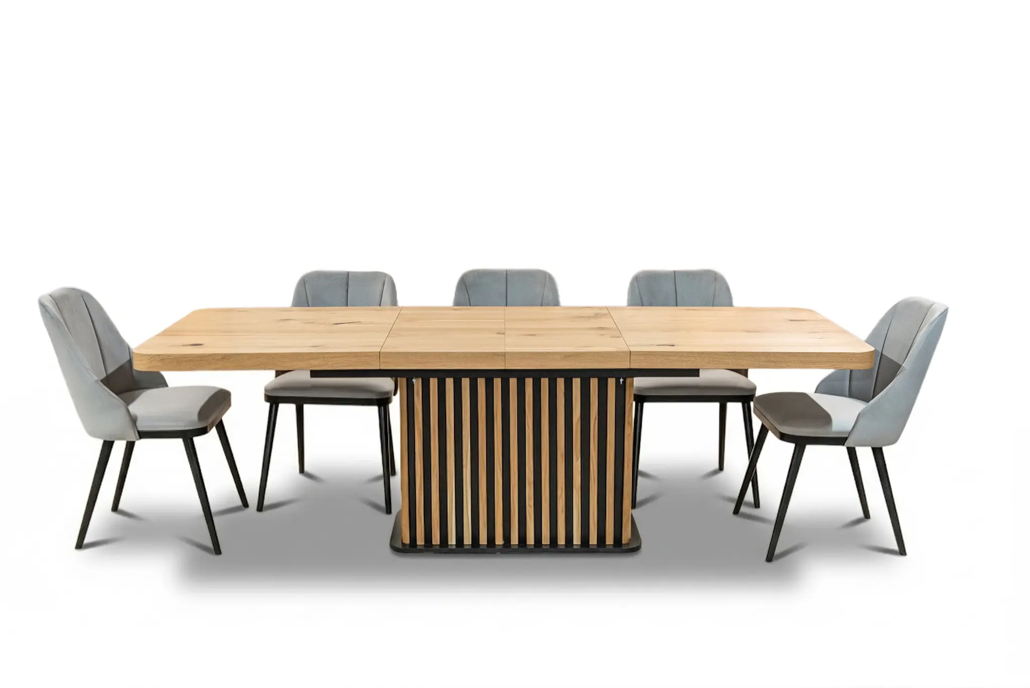 Stół rozkładany o wymiarach podstawowych 160/90 cm z możliwością rozłożenia dzięki dwóm wkładkom po 40 cm każda. Maksymalna długość stołu po rozłożeniu wynosi 260 cm. Konstrukcja wsparta jest na solidnej, czarnej podstawie. System rozkładania pozwala na dostosowanie wielkości blatu do aktualnych potrzeb, a solidna konstrukcja zapewnia stabilność w każdej konfiguracji.
