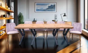 Stół Loft P1 Dębowy Fornirowany to nowoczesne połączenie designu, funkcjonalności i naturalnego piękna drewna. Blat z naturalnego forniru dębowego zachwyca loftowym charakterem – z widocznymi sękami i usłojeniem. Standardowy rozmiar 100 × 150 cm można wydłużyć do 350 cm dzięki czterem wkładkom, co pozwala wygodnie ugościć nawet 20 osób.