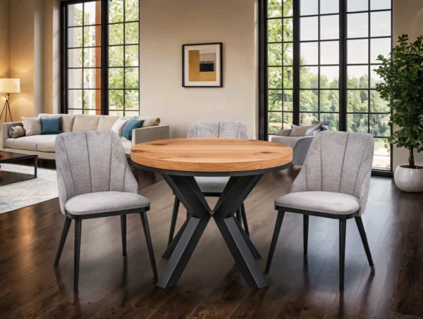 Stół LOFT o średnicy 100 cm to idealna propozycja dla miłośników stylu loftowego i industrialnego. Wykonany z naturalnego dębu i nowoczesnej metalowej konstrukcji, łączy elegancję drewna z wytrzymałością metalu. Dzięki dwóm wkładkom po 50 cm i prostemu mechanizmowi rozkładania, stół jest funkcjonalny i przestronny, a po złożeniu zajmuje mało miejsca. Ciekawy design nóg dodaje charakteru wnętrzom w stylu loftowym i nowoczesnym.