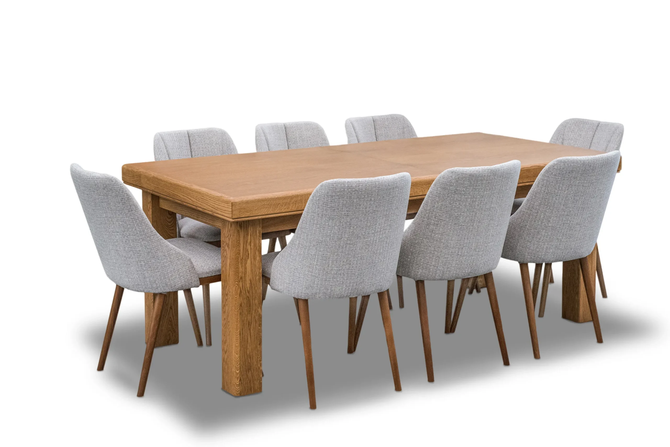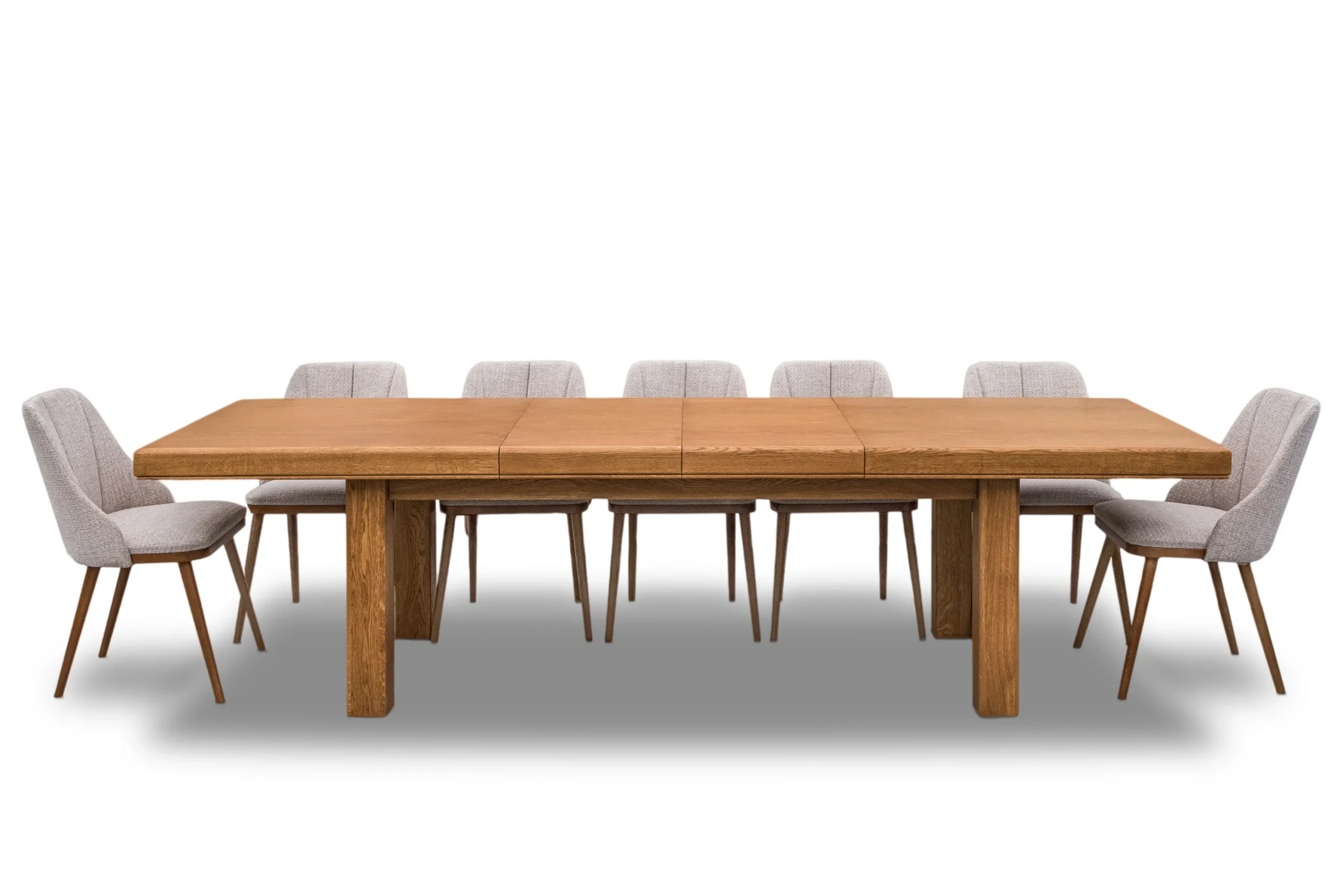 Stół LYON to kwintesencja stylu i solidności. Wykonany z naturalnego drewna dębowego z elementami fornirowanymi, imponuje masywną konstrukcją i prostą, klasyczną formą. Gruby blat oraz nogi o pełnym przekroju podkreślają jego trwałość i prestiżowy charakter. To idealny wybór do jadalni, salonu lub przestrzeni reprezentacyjnej.